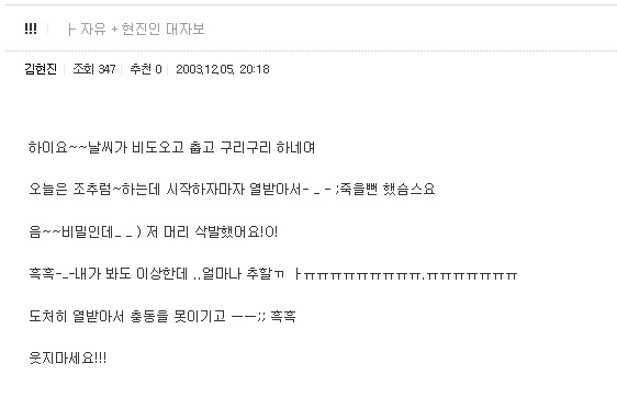 그들은 스폰서가 없었지만 실력이 있었음으로 신념을 지킬 수 있었다. 그런 강한 사람들 사이에서 김현진은 신념을 지키려고 노력했지만 힘이 들었을게 분명하다. 그래프로 따지면 자신은 하향 곡선인데 상향 중인 동료를 만난 것이다. 더불어 임요환, 최연성과 같은 테란이라 비교됬을 것이다. 보통 사람 같은 경우 그런가보다,하고 넘어갈 수도 있을지 모르지만 김현진 선수는 누구보다 세밀하고 섬세한 사람이었다. 아니, 반드시 섬세해서가 아니라고 누구든 그 상황이 온다면 혼란스러웠을 것이다. 처음부터 엄청난 돌풍을 몰아치고 왔는데 자신은 별볼일 없어지고, 팀원들에 대한 죄책감, 팬들에 대한 미안함, IS에 엄청난 돈을 주고 자신을 소속시켜준 감독님에 대한 용서를 바라는 마음이 항상 있었다. 나 초등학교 여름방학 내내 겜비씨 틀며 게임을 봤는데 그때 당시 김현진 선수 경기를 보며 답답해 했다. 뒷심부족, 우왕좌왕, 유리할 때 적극적이지 못한 스타일. 초등학생도 그걸 느끼겠는데 플레이를 한 선수는 오죽하겠나? 결국 김현진은 자신의 마음을 단단히 먹고자 '삭발'을 감행하게 된다.
