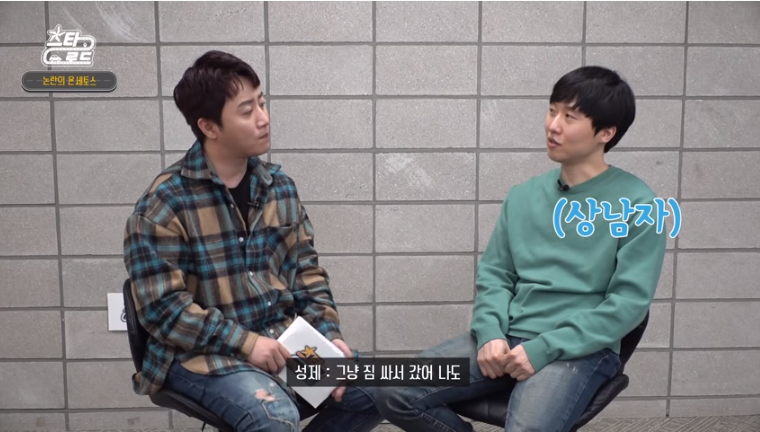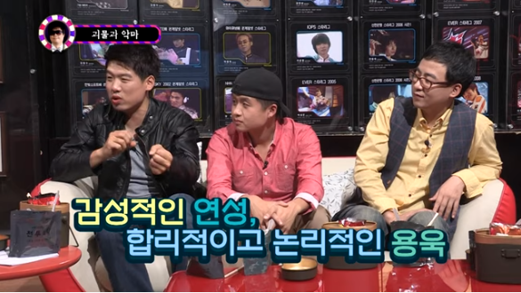 -최연성 : 용욱이랑 저랑 사이가 안좋았었거든요. 성격이 극이에요 극. 저는 감성적이고 용욱이는 합리적이고 계산적이고 냉철한 쪽이고. -엄재경 : 약간 반대일것같은데. -최연성 : 아니요. 진짜에요. 겪어보면 알게 될꺼에요. 그랬는데 맨날싸웠어요. 막 싸우다가 이제 성적이 둘다 안나오는 거예요. Star "Happy Show" S3_Happy Market Ep2_스타행쇼 시즌2 포장마차 2회 by ongamenet (3 |