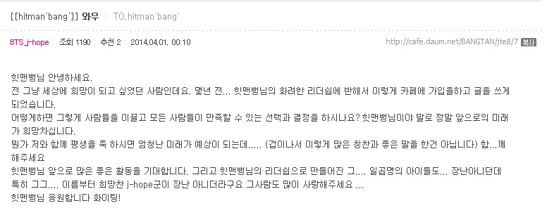 과거 자기의 팬카페를 방시혁 팬카페로 바꾼 방탄소년단