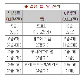 ▶ 박성준 3대2 이병민 박성준(저, 7시) <포르테> 승 이병민(테, 5시) 박성준(저, 9시) 승 <네오퀴엠> 이병민(테, 6시) 박성준(저, 5시) 승 <루나더파이널> 이병민(테, 2시) 박성준(저, 5시) <라이드오브발키리즈> 승 이병민(테, 7시) 박성준(저, 11시) 승 <포르테> 이병민(테, 7시) |