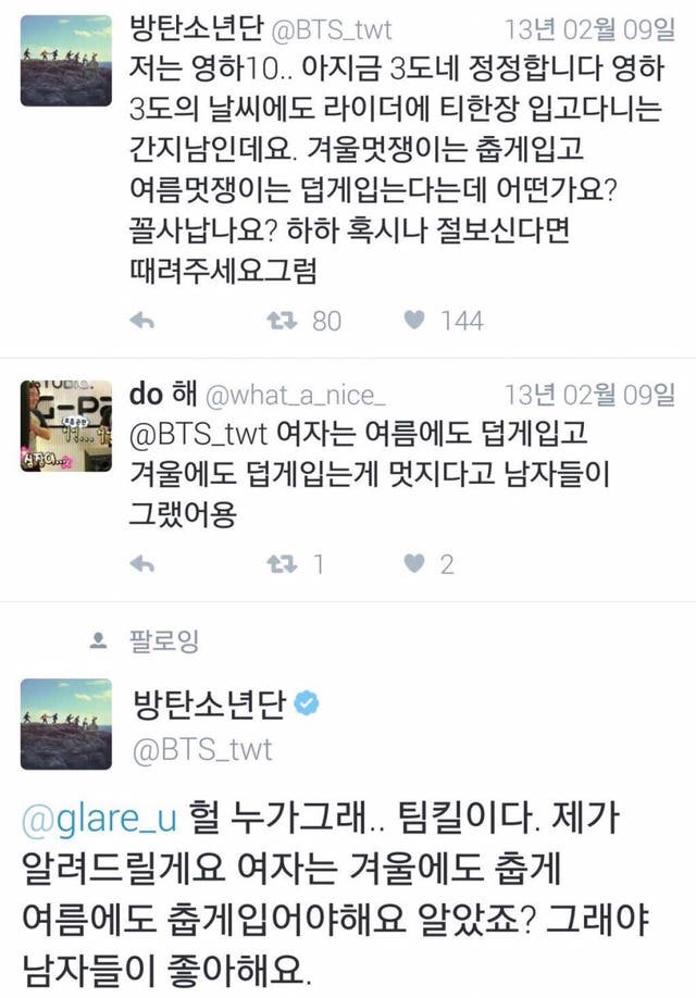 좀 웃긴 이야기일지도 모르지만 남자도 그렇고 여자도 그렇고 이성이 원하는 포인트를 꾸역꾸역 무시하고 본인들이 보여주고 싶은 모습만 보여주는 것 같다. 남자를 예시로 들어 볼까? 사실 여자들은 미소년 스타일을 좋아하거든. 그래서 여성팬을 타겟으로 한 아이돌들이 하나같이 흰 피부톤, 깔끔하게 정리한 눈썹, 센스있는 패션, 게이스럽다고 손가락질 받는 화장한 얼굴인 경우가 대부분이다. 그런데 남자들은 “절대 그렇지 않다! 남자다운 스타일을 여자들이 좋아할 거다!” 라면서 남자 사이에서나 인정받을 법할 삭발, 태닝, 수염, 근육 뭐 이런것에 노력한다. 여자친구를 사귀고 싶다는 남자들이 외모를 가꾸는게 아니라 헬스장에 가는 것도 이와 같은 이유지 뭐. 하지만 예나 지금이나 근육 빵빵남보다 여자들이 좋아하는 남자 스타일은 게이취급 받는 예쁜 남자다. 과거 힙합초대석에서 방탄소년단이 래퍼들에게 게이같다, 왜 화장하냐, 여장하냐 라는 말을 들어도 결국 여자들이 연애하고 싶은 대상은 빡빡머리 문신 헤비스모커 힙합전사가 아닌 방탄소년단인 것처럼 말이지.