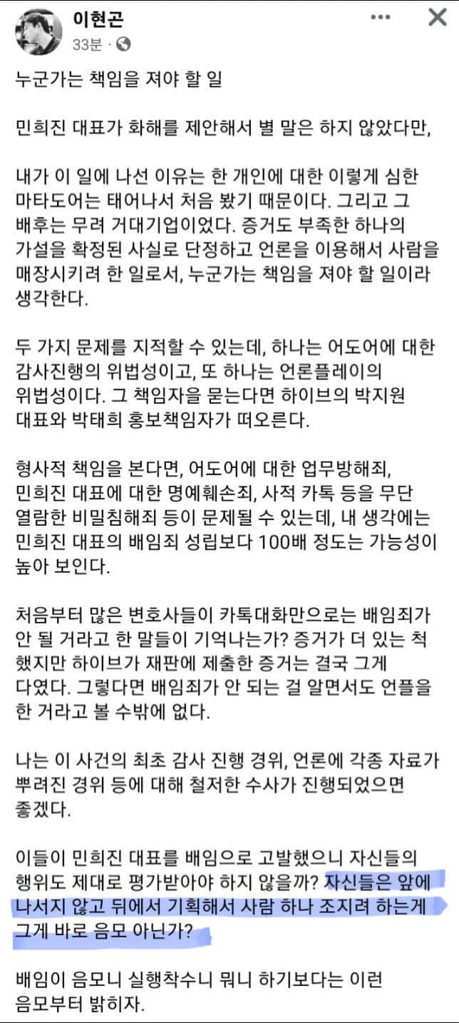 그로인해 민희진이 아닌 방시혁이 배임죄가 될 수 있다고 난리 쳤던 판사 출신 변호사는