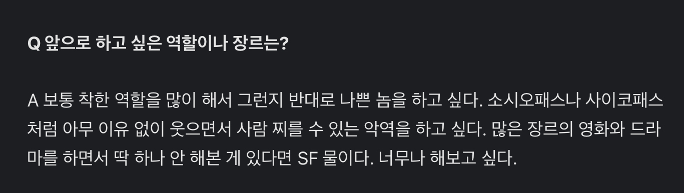 악역, sf, 소시오패스역을 한번 해보고 싶다며 인터뷰에서 말했다.