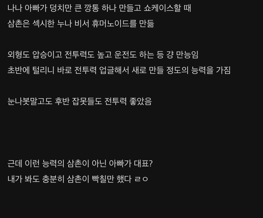 나나 아빠가 덩치만 큰 깡통 하나 만들고 쇼케이스할 때삼촌은 섹시한 누나 비서 휴머노이드를 만듦외형도 압승이고 전투력도 높고 운전도 하는 등 걍 만능임초반에 털리니 바로 전투력 업글해