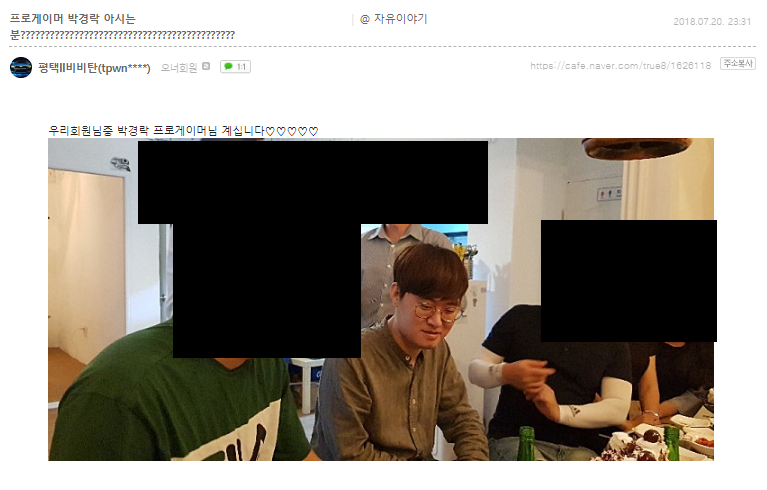하지만 주변 프로게이머들의 방송을 보고 있는지 2017년 7월, 박태민의 방송에 별풍선 100개를 보냈다. 물론 아이디만 보고 박경락이라고 단정 지을 수 없었고 전위라는 아이디를 좋아하는 유저이거나, 박경락의 팬이라서 같은 아이디를 만드는 것일 수도 있으니깐. 그렇게 성과가 전혀없는 박경락의 근황을 찾아다녔고 결국 내가 찾은 최근이자 가장 정확한 근황은 네이버 카페에 있었다.