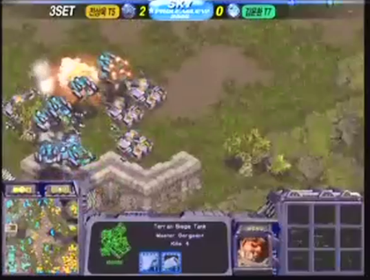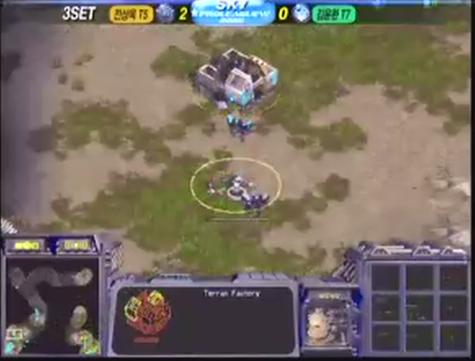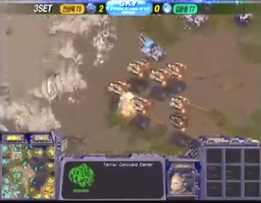 이제부터 드랍십 싸움이다. 하지만 미네랄도, 드랍십의 수도 전상욱이 더 우위. 더불어 둘의 스타일이 비슷한건가? 오직 전세역전할 한방만을 노리고 있는 것이다. 그리고 먼저 공격을 시도한 전상욱. 동시에 김윤환은 여전히 방어적인 스타일로 나간다. 전상욱이 1시를 공격하면 드랍십을 이끌고 병력을 떨어트려 방어. 9시를 공격하면?