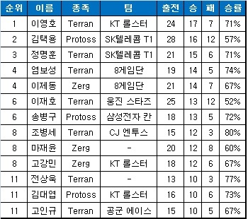 SK플래닛 프로리그 시즌 1 포스트시즌 승률표