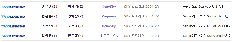 | 변은종(Z) | 이윤열(T) | Nostalgia | SKY 프로리그 2004 | 1R 22회차 SG패밀리 vs SouL 2경기 | 04-07-03 | |