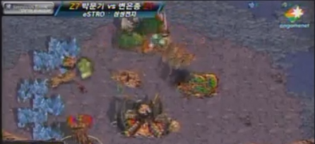 박문기는 아래에 몰래 숨겨진 4기의 저글링으로 변은종의 본진으로 기습 공격한다.